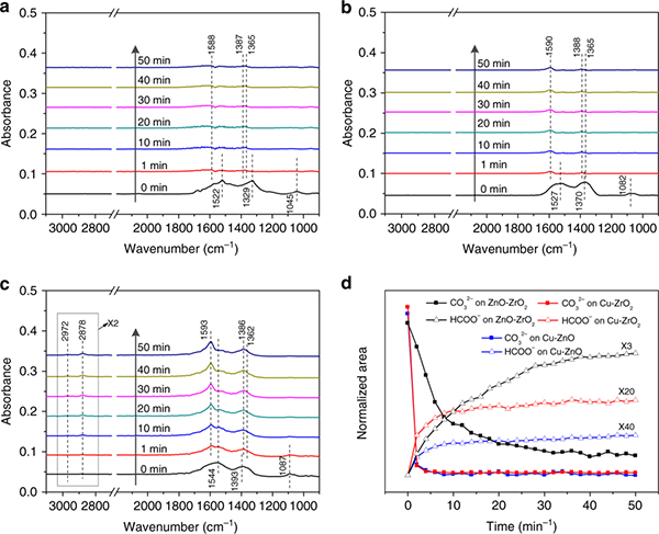 (a) 在大气压、493K条件下,将原料气由CO2转换为H2(流速为40 mL / min)后Cu-ZnO材料的原位DRIFT光谱;