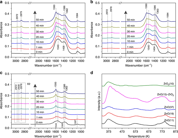 (a) 在大气压、493K条件下,将原料气由CO2转换为H2(流速为40 mL / min)后ZnO(15)–ZrO2的原位DRIFT光谱;
