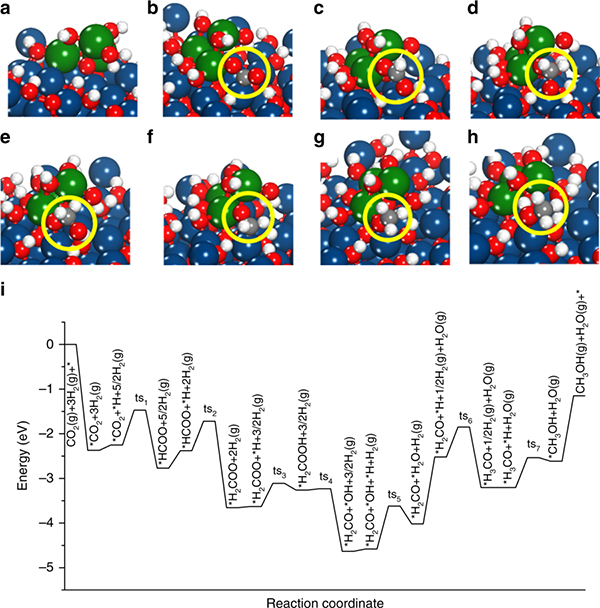 (i) 通过甲酸盐途径在ZrO2 / ZnO (11`20)界面处CO2氢化成CH3OH的能量分布。