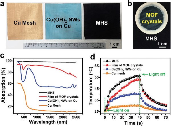 c) MHS、Cu-CAT-1 MOF晶体膜、铜网上Cu(OH)2 NWs和商业铜网在太阳光谱(250-2500 nm)范围内的光吸收光谱;