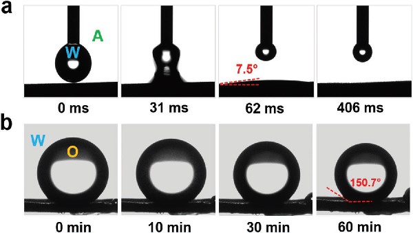 a) 随时间变化的水接触角测试,捕获MHS上水滴的润湿过程,“A”(绿色)代表“空气”,“W”(蓝色)代表“水”;