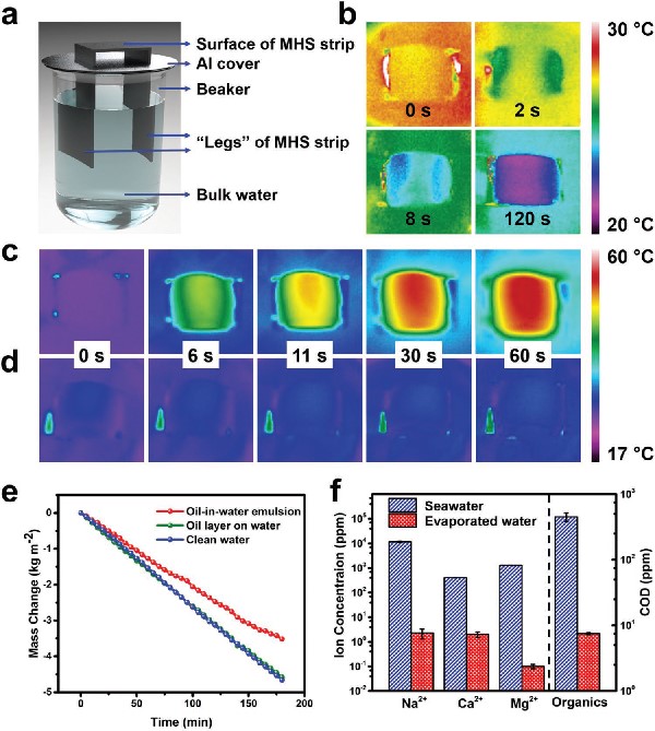 e) 由MHS条带制备的器件在清水、油层覆盖的水和水包油乳液中,1个太阳照射下质量随时间的变化;