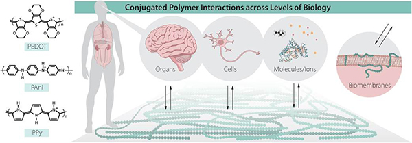 图一、共轭聚合物材料在不同的层次上(从器官、组织到分子和离子)的生命体相互作用