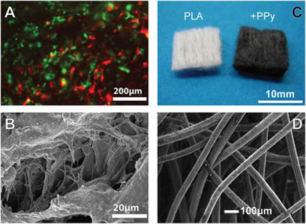 (C~D)(C)光学显微镜和(D)电镜图展示了一个由PPy构成的结构:用于人类干细胞培养的软骨素-硫酸盐涂覆聚乳酸(PLA)纤维。