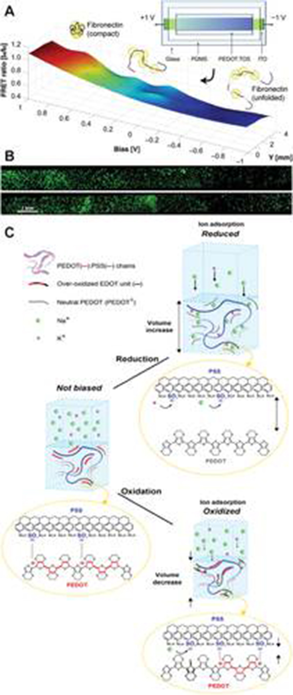 (A)热图显示了FRET标记的纤连蛋白的构象,从紧密(红色)到展开(蓝色),吸附在PEDOT:tosylate装置上,如图右上角所示;