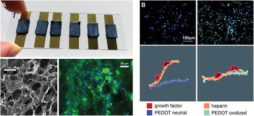 (B)表面连接生长因子的PEDOT:肝素可在中性状态下维持大鼠干细胞的多能性(左图),而氧化状态下则诱导神经分化(右图),如图所示(顶部图中蓝色:细胞核;绿色:巢蛋白)。调节机制如底层图所示(底部)。