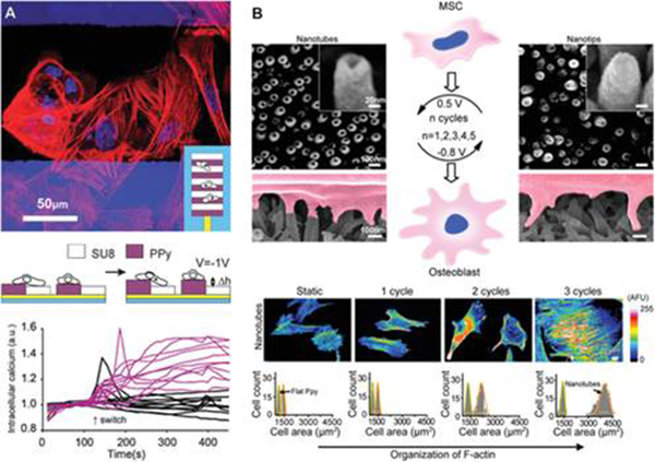 (B)制备纳米管表面的PPy:DBS可以通过还原/氧化可逆地转变为纳米尖端构象,通过电镜图(顶部),图示表明其显著影响人类干细胞(MSC;粉红色)附着力。多次循环后,这刺激了肌动蛋白纤维组织(中间;假彩色荧光图像)和细胞分散(底部),通过机械转导致使成骨分化。