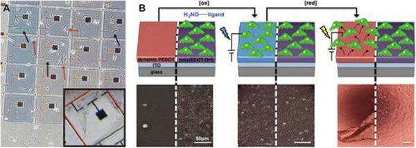 (A)带有两种类型人类细胞(红色和黑色箭头)的PEDOT-S:H矩阵阵列的显微镜图像。插图显示细胞从选定的栅格中(红色轮廓)分离,其中组合的行和列电压超过氧化阈值导致CP降解;