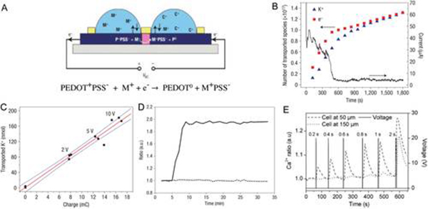 (A)有机离子泵原理图。两个PEDOT(P):PSS电极(深蓝色)、源电极(左侧)和目标电极(右侧)被一个电子绝缘但离子导电的区域(过氧化PEDOT:PSS,粉色)隔开。源电极浸在浓度相对较高的阳离子M+电解质中,并与膜中的PSS结合。电极之间施加了电势,左电极被氧化。带正电荷的PEDOT与带负电荷的PSS相互作用,释放出一个阳离子。右边的电极被还原,从左到右有一个阳离子的净流动;