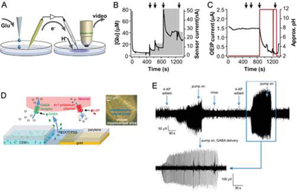 (D)PEDOT:PSS的混合电导性使GABA神经递质离子泵送(左)和电记录(右)在同一位点;