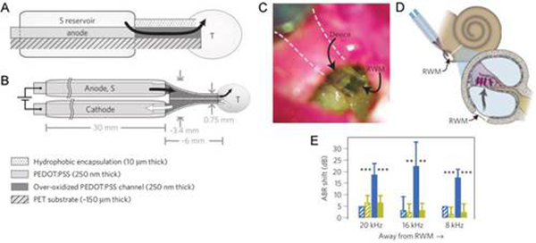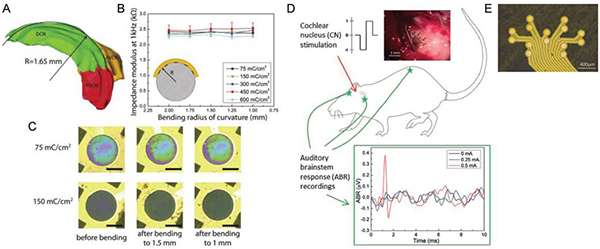 图五、在柔性聚酰亚胺上的PEDOT:PSS包覆铂电极用于听觉脑干刺激