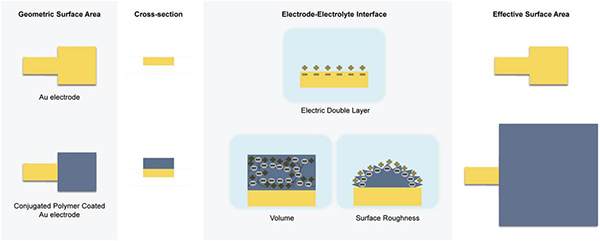 由于CP膜所提供的膨胀体积或表面粗糙度,电极-电解质界面变得更大。在电荷检测(记录)和传输(刺激)方面,界面面积增加使得离子-电子传导改善。增加电极的有效表面积可通过降低阻抗(记录)和增加电容(刺激)来改善其性能。(示意图未按比例绘制)