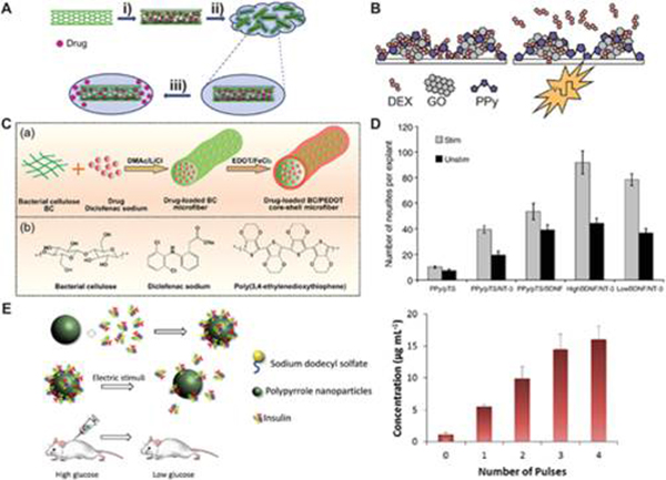 (B)氧化石墨烯/PPy/药物纳米复合材料(左)和药物在电刺激下释放的示意图(右);