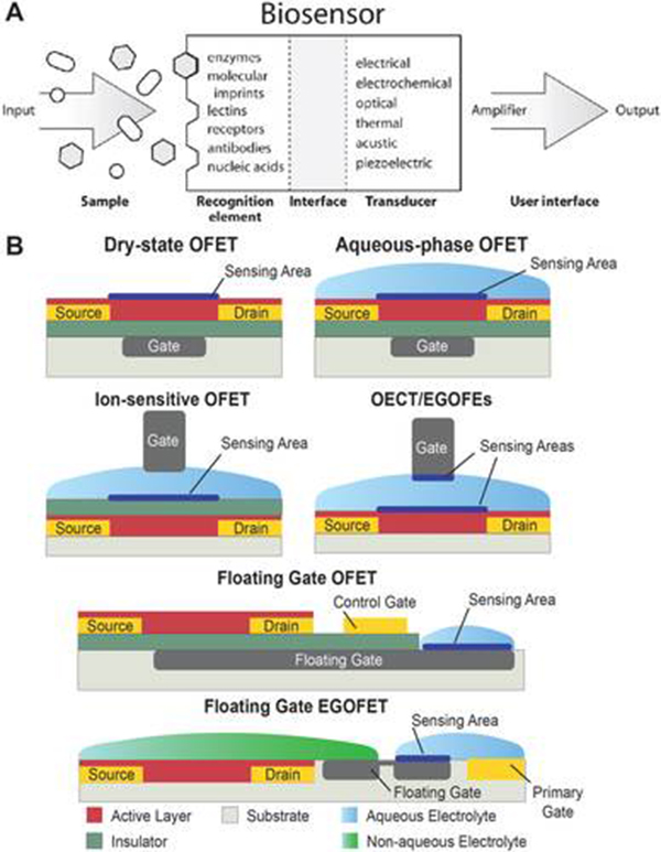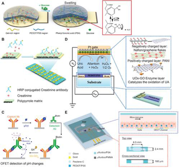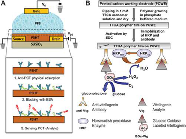 (A)基于OTFT的免疫传感器。物理吸附在聚(3-己基噻吩)上的抗降钙素原(PCT)抗体作为感应元件,牛血清白蛋白作为阻断元件;