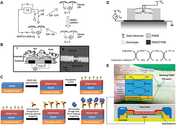 (B)用于葡萄糖检测的纳米结OECT活性层的示意图(i)和SEM图像(ii)。聚(苯胺):聚(丙烯酸)(PAni:PAA)作为活性材料,HSO4−作为PAni的掺杂剂,葡萄糖氧化酶作为生物识别元素,聚(1,2-二氨基苯)(PDAB)作为固定剂;