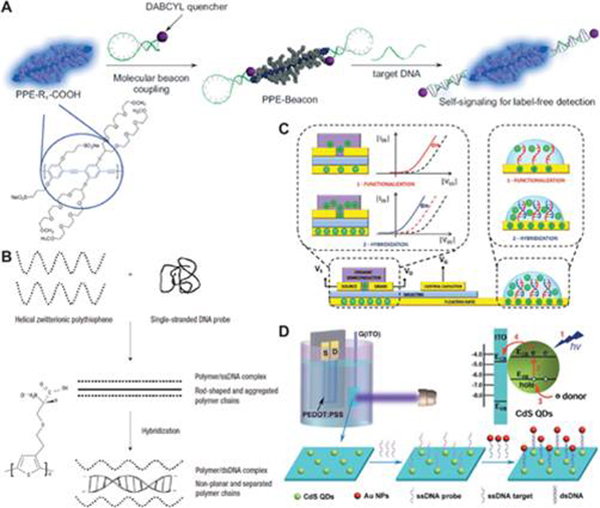(A)聚对苯乙炔基CPE(PPE-R1-COOH)与猝灭剂标记的单链DNA结合形成“分子信标”,其通过DNA构象的变化来感知目标DNA的存在;