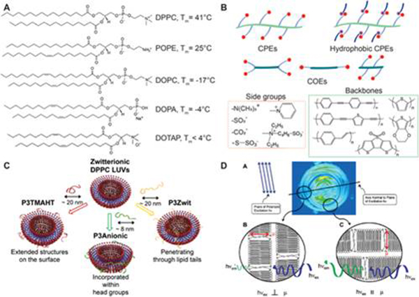 (C)带正电的噻吩基CPE(聚(3-(6-三甲基铵噻吩),P3TMAHT),带负电荷的噻吩基CPE(聚[3-(6-磺基噻吩基)噻吩),P3Anionic)和两性噻吩基CPE(聚[3-(N-(4-磺酸基-1-丁基)-N,N-二乙基氨基噻吩基)-2,5-噻吩),P3Zwit),与DPPC囊泡之间可能的相互作用示意图;