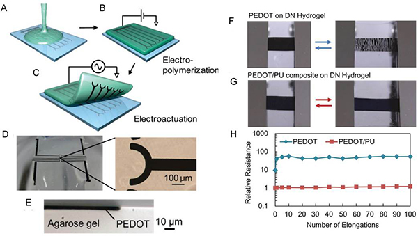 (F~G)拉伸时双网水凝胶裂纹上的PEDOT(F),而拉伸后双网水凝胶上的PEDOT/聚氨酯复合材料不开裂(G);