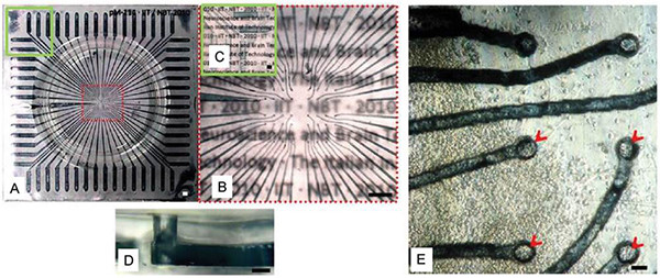 (A)具有传导PEDOT:PSS磁道(蓝色),包括衬垫、通道和记录点的60微电极阵列。标尺:1 mm;