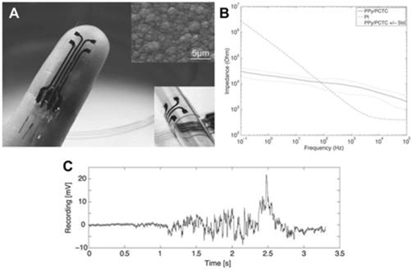 (A)聚(二甲基硅氧烷)中1 mm直径的聚吡咯/聚己内酰胺-嵌段-聚丁二醚-嵌段-聚己内酰胺(PCTC)电极。顶部插图:描述电极表面粗糙形貌的电镜图。底部插图:电极绕着玻璃吸管转动,显示了它的柔韧性;