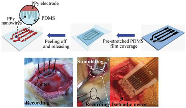 将预拉伸的PDMS施加到电极上,释放并剥离,制备以纳米线形式将其锚定在PDMS中的波状PPy电极。电极阵列用于健康和癫痫小鼠的ECoG以及坐骨神经的刺激。