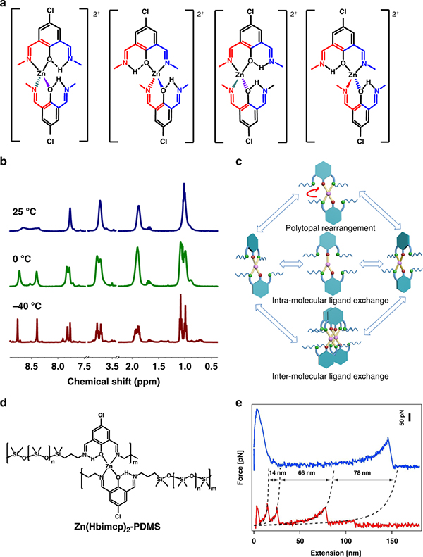 近日,南京大学李承辉、左景林教授与斯坦福大学鲍哲南教授合作,报道了一种含有热力学稳定而动力学不活泼配位化合物的自愈合聚合物。所制备的Zn(Hbimcp)2-PDMS聚合物不仅具有高度可拉伸性(高达2400 %应变)和高韧性(29.3 MJ×m-3),并且可以在室温下自动愈合。对照实验表明,配位键结合强度和动力学活性的优化组合是获得材料韧性和自愈合性质的原因。该分子设计理念为制备具有优异机械性能的自愈合聚合物提供了方向。该成果以题为” Thermodynamically stable whilst kinetically labile coordination bonds lead to strong and tough self-healing polymers “发表在国际著名期刊Nature Communications上。