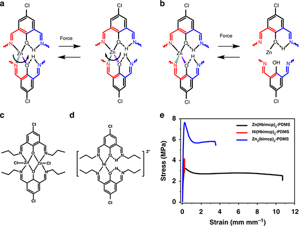 本文中,为了进一步解决材料的机械性能和自愈合性质之间的难题,作者设计并合成了一种含有热力学稳定而动力学活泼的配位化合物的PDMS聚合物。该配位化合物具有较大的结合常数,但也能够实现快速、可逆的分子内/分子间配体交换。研究表明,制备的聚合物具有良好的可拉伸性和高韧性,同时还可在室温下实现自愈合。通过改变金属离子和金属与配体的摩尔比,发现配位键的结合强度和动力学活性在材料的机械性能和自愈合性能中起着关键作用。本文提供了一种具有优异机械性能的自修复聚合物的设计思路,而且该种聚合物有望作为抗冲击材料得到实际应用。