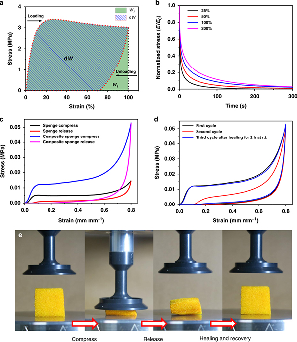 (e) 复合海绵在压缩、愈合和恢复过程中的光学图像。