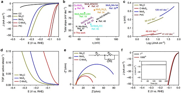 2. 相比于非掺杂的MoS2, 碳掺杂的MoS2(C-MoS2)展现出色的碱性析氢性能,在10mA cm-2下的过电位是45mV。