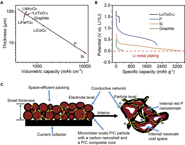 (B)典型负极(Li4Ti5O12、石墨、红磷和硅)的锂化电位曲线。由于容量高和合理的嵌锂电位,红P是用于快速充电LIBs的理想负极材料:相对于钛酸锂负极较低的工作电压有利于电池整体高输出电压,相对于石墨和硅较高的工作电压有利于在高锂化电流密度下的实现高容量保持率,同时避免金属锂析出引起安全问题。