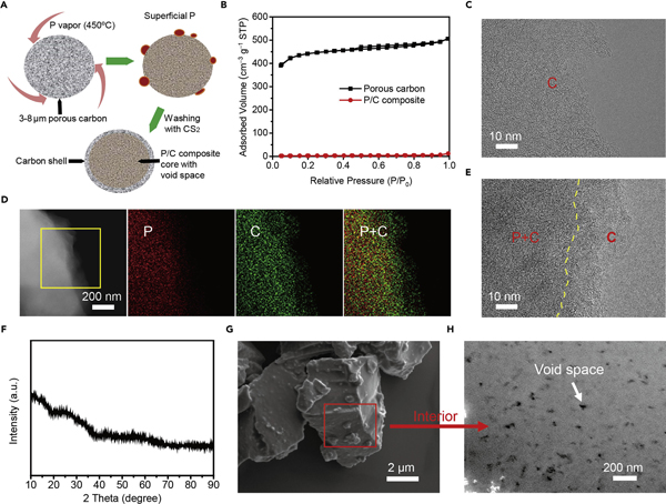 (A)合成P/C纳米复合材料的示意图。将微米尺度纳米多孔碳和红磷粉末在氩气氛中密封,450 ºC退火,使P通过P蒸气的扩散进入碳材料纳米孔结构中。去除表面的P后,得到了表面为纯碳纳米层的P/C复合颗粒,颗粒内部为纳米尺度孔隙和红P纳米团簇。