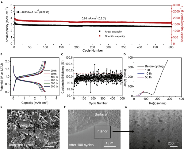 (F,G)P/C复合颗粒在100次充放电循环后的(F)截面SEM图。其中(G)是放大图。颗粒截面由FIB实现。