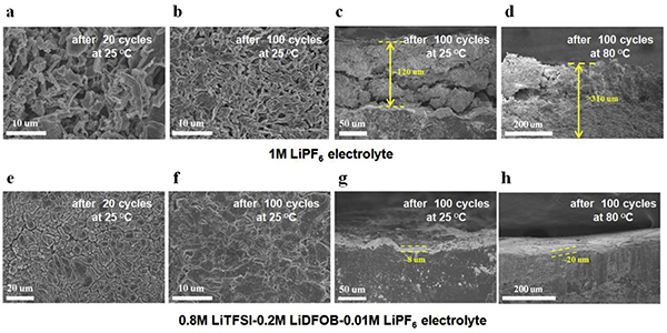 (e-h)锂金属在使用0.8M LiTFSI-0.2M LiDFOB-0.01M LiPF6电解液的Li阳极的表面SEM图像和截面图