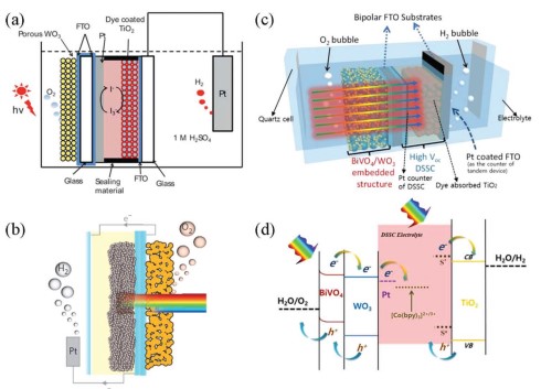 a)由Park团队制作的带有DSC和WO3光电极的PV/PEC串联电池示意图。b)由Sivula等人设计的WO 3/ DSC串联电池的示意图。c)由WO 3 / BiVO 4光电阳极和DSC 组成的无线单片串联电池配置的图示。d)(c)中串联系统的能带结构和电荷转移。