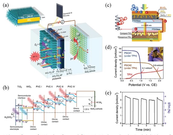 a)由Si PV,WO 3/ TiO 2光阳极和MoS 2阴极组成的PEC串联电池的示意图。b)(a)中PEC串联电池的能带结构的示意图。c)TPH光电阳极和PSC串联装置的示意图。d)最佳TPH光阳极(具有CoO x电催化剂)和PSC(在TPH光电阳极下)的J – V曲线。交点(≈3.9mAcm -2)表示无辅助水分离装置的预期操作点。e)光电流密度和计算的STH效率作为串联电池(TPH / PSC#2)的时间的函数。