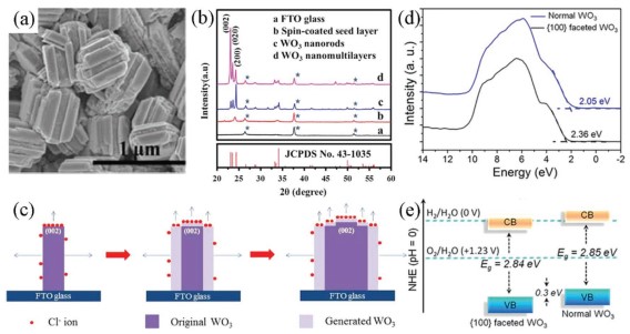 a)WO 3纳米多层膜的SEM图像。b)FTO玻璃,旋涂层,WO 3纳米棒和WO 3纳米多层膜的XRD图案。c)WO 3纳米多层膜的晶体生长过程的示意图。箭头的方向和长度分别表示不同刻面的生长方向和生长速度。d){100}刻面WO 3和普通WO 3的XPS价带谱。e){100}刻面WO 3和普通WO 3的能带的相对位置的方案。