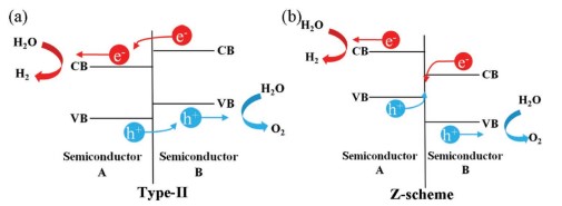 光生载流子在a)II-型异质结和b)Z-型异质结中传输的示意图。