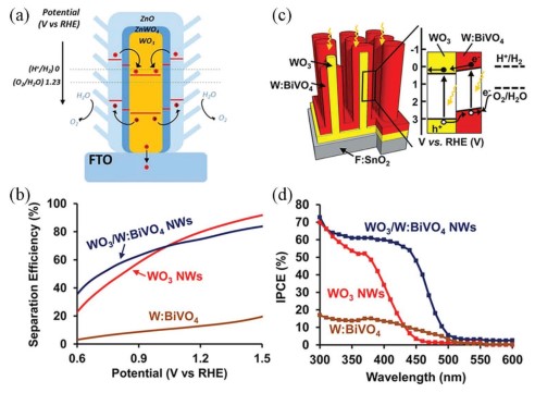 a) WO3-ZnWO4-ZnO异质结界面的能带和载流子转移示意图。(b) WO3/W:BiVO4 NWs、WO3 NWs、W:BiVO4膜的电荷分离效率。c)核壳NWs与II-型交错WO3/W:BiVO4异质结的结构示意图和能带图。d) WO3/W的IPCE:BiVO4 NWs,WO3 NWs和W:BiVO4 膜测量值为23 V比RHE。
