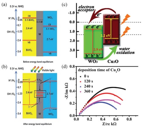 a,b)FTO-BiVO 4 -W-WO 3 Z-型光电阳极的能带结构。c)WO 3 NRs / Cu 2 O异质结的能带结构的示意图。d)不同Cu2O沉积时间下WO3/Cu2O光阳极的EIS图。