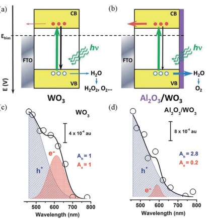 a)WO 3和b)Al 2O 3 / WO 3在辐照下的电荷转移示意图。红色实心圆圈和蓝色空心圆圈分别代表电子和空穴。红色箭头和蓝色箭头的方向分别表示电子和空穴的传输方向。绿色箭头表示电子 – 空穴对的光生成,黑色箭头表示重组损失。箭头越粗,过程越快。激光闪光光解后2μs的解卷积TAS光谱c)WO 3和d)Al 2 O 3 / WO 3。考虑了陷阱(蓝色)和陷阱电子(红色)的贡献。原始数据(圆圈)和拟合数据(实线)之间的回归系数大于98。被捕获电子(A e)和被捕获空穴(A h)的相对贡献揭示了WO 3和Al 2 O 3 / WO 3中被捕获电子和被捕获空穴的数量。