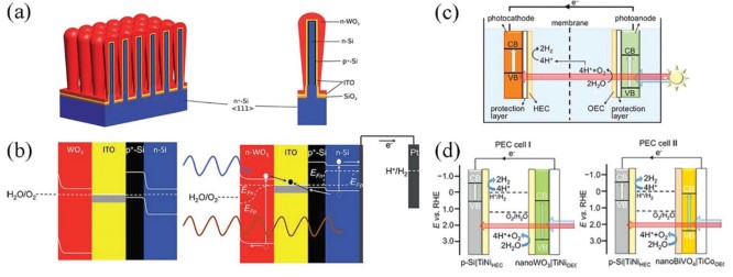 a)串联式微丝阵列,其具有由ITO和n-WO 3涂覆的掩埋同质结(n-p + -Si)(左)和单个串联结阵列单元电池的2D横截面(右)。b)串联装置在黑暗(左)和下照(右)下的稳态电子结构。c)用于太阳能水分解的串联PEC电池的示意图。d)由p-Si|TiNi HEC光电阴极与纳米WO3|TiNi OEC光电阳极(左)或纳米BiVO4| TiCo OEC光电阳极(右)组成的用于太阳能劈水的串联PEC电池示意图。