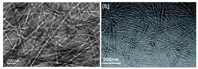 图二:直观的表征小分子水凝胶微观自组装结构:纳米带(左)、纳米纤维(右)