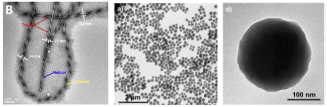 利用TEM的质厚衬度像(吸收衬度像)可以对样品形貌进行表征,其中就包括样品形貌的尺寸的大小、分布、排列等。如图四左6,KE-F8多肽由于F(苯丙氨酸)氨基酸强烈的π-π相互作用,使得多肽主要呈现β-sheet结构,两周后。多肽水溶液通过自组装形成了更长的扭曲的纳米带结构,通过测量,清楚的表征出纳米带的宽度范围在25-34nm。另外,YYAYY短肽中利用Y(酪氨酸)氨基酸中的侧链基团的苯酚结构在催化作用下进行交联作用,从而使得短肽分子自组装形成了球型纳米凝胶结构(如图四中、右)7,通过TEM的表征和测量,中间的是TEM的大范围的显示图,可以看到大量结构均一分布较为均匀的球型纳米凝胶结构,进一步的小范围高分辨的TEM图(右图)测得其球型纳米凝胶的平均粒径在200nm。当然,对于平均粒径一般可以进行多点多次统计测量计算得出。