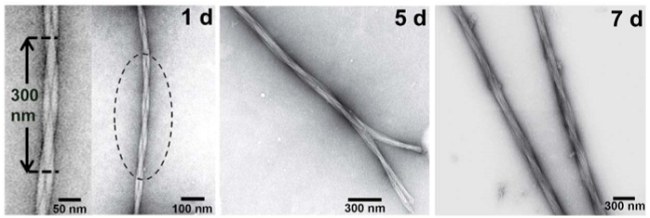 超分子自组装结构形貌一般有纳米带、纳米纤维、纳米管、纳米线、纳米片、胶束球等。下面我们简单介绍了易于形成凝胶两种典型纳米结构形貌。I3QGK短肽分子链在水中主要是β-sheet构像主导,在水中易于形成均一细长的纳米带结构(如图二左)3,I3QGK纳米带是相对刚性的,其扭曲和/或螺旋的迹象相当有限,可能是由于Q氨基酸残基的影响导致其β-sheet结构控制短肽分子形成平而长的纳米带结构。另外,类似的。利用开环聚合的方法得到的(G-EA)m-Tyrn短肽分子也通过自组装形成了细长的纳米纤维的结构形貌(如图二右)4,进而相互缠结形成凝胶网络。此外,超分子自组装结构有时对某一因素具有依赖性,比如自组装结构会随着某一因素(如pH、温度、时间等)的变化而改变,由此,TEM的表征显得尤为重要,它的表征可以跟踪表征每个时间段的某一时刻的组装结构,从而清晰直观的了解自组装结构的额演变或生长过程,进而服务于超分子自组装体系的机理研究。如图三所示5,比较清楚的表征了样品自组装结构随某一因素pH变化而变化的演变过程研究。即混合末端含两亲性肽后的DNA-和PNA(肽核酸)-在1、5、7天的演变过程,从第一天生成的有节距的纳米纤维丝对结构随时间的变化的趋势,组装结构逐步生长成为到第七天的纳米纤维束。