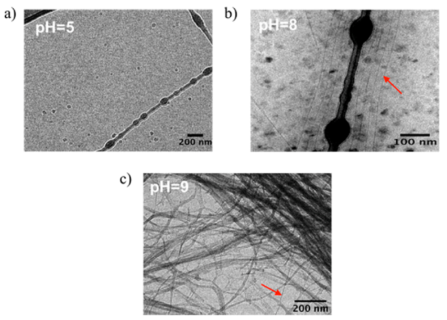C16-K2两亲性多肽链由于K(赖氨酸)氨基酸的侧链基团氨基可以质子化和去质子化作用,使得该多肽分子具有一定的pH响应性,从而使得该多肽分子约在pH=7.5一下容易自组装形成球型胶束结构,而在弱碱性环境pH=8附近主要形成细长的纳米纤维结构,pH大于8.3,其自组装结构主要会形成双分子层的纳米带状结构。如图五8,直观的表征自组装结构随某一因素pH改变而导致组装体结构趋势变化过程和真实形貌,(a) pH值为5时,只观察到球形胶束结构。(b) pH值为8时溶液显示细长的纳米纤维结构(红色箭头)。 (c)在pH值9时,可以观察到扁平的带状结构,同时也有迹象表明长纤维(红色箭头)类似于pH值8时形成的纤维。