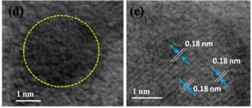 上图(d, e)为CQDs的HR-TEM图,晶格条纹间距0.18nm,下图(e, f)为BSN粒子的HR-TEM图,晶型多为十面体和二十面体形状的球形结构。