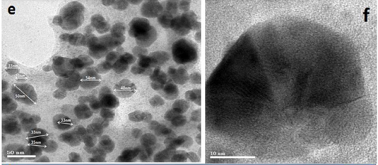 如图六(上,d,e)9以芦荟叶凝胶制备碳量子点(CQDs),作者制备了粒径范范围为1.5nm-3.7nm,水动力直径为2.67nm的球型CQDs,通过HR-TEM的表征,图六上(d)和(e)为均匀间距为0.18 nm的CQDs晶格条纹图像,对应于石墨碳的(100)衍射面。另外,如图六(下,e,f)10,作者通过生物合成的方法制备纳米银粒子(BSN),从图六下e图可以看出,合成的BSN具有良好的分散性,多为十面体和二十面体形状的球形结构。图六下f图给出了一个具有十面体形状的纳米颗粒。