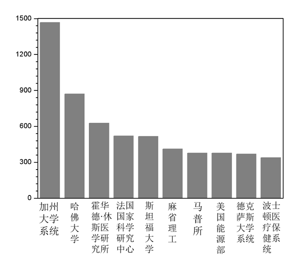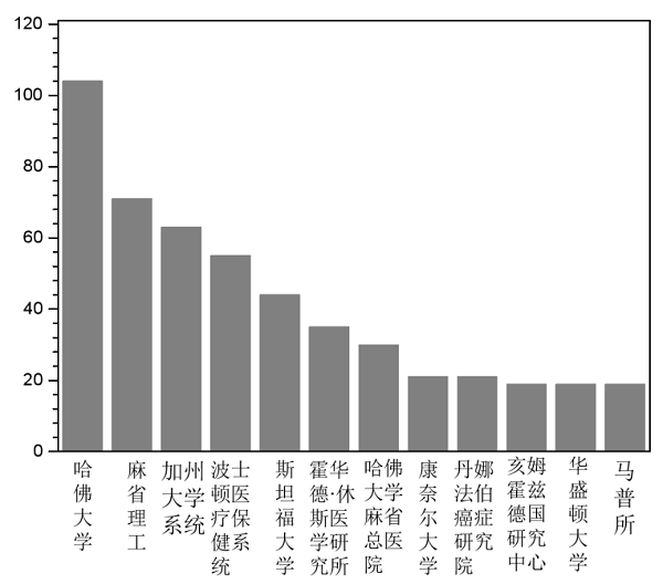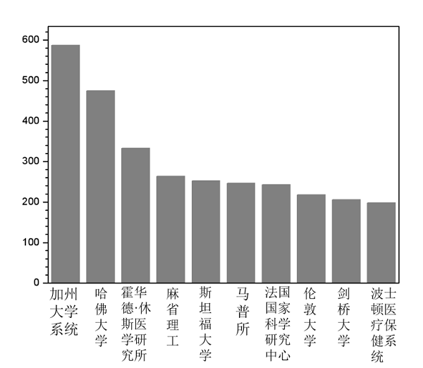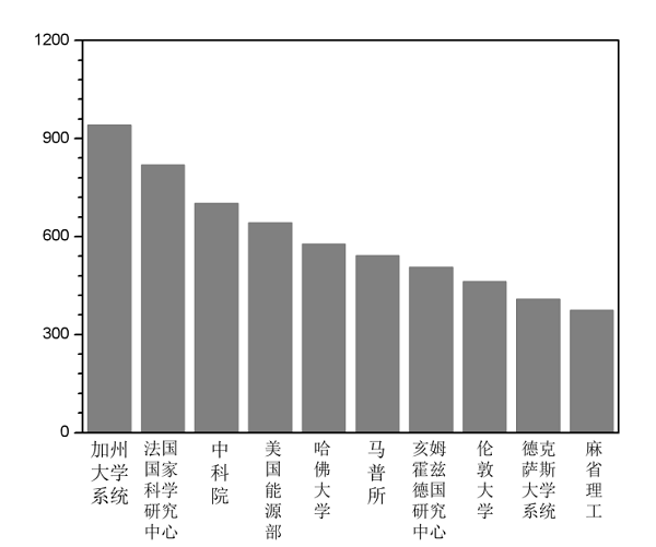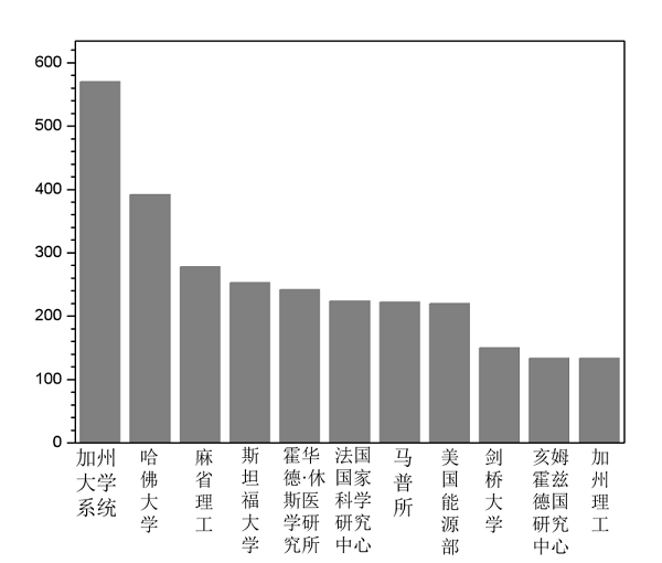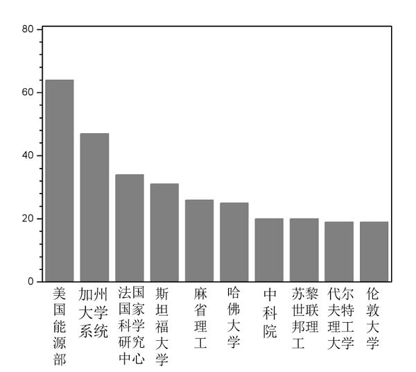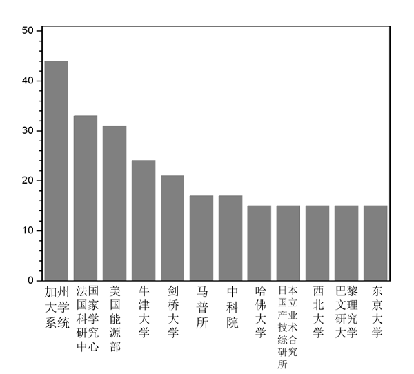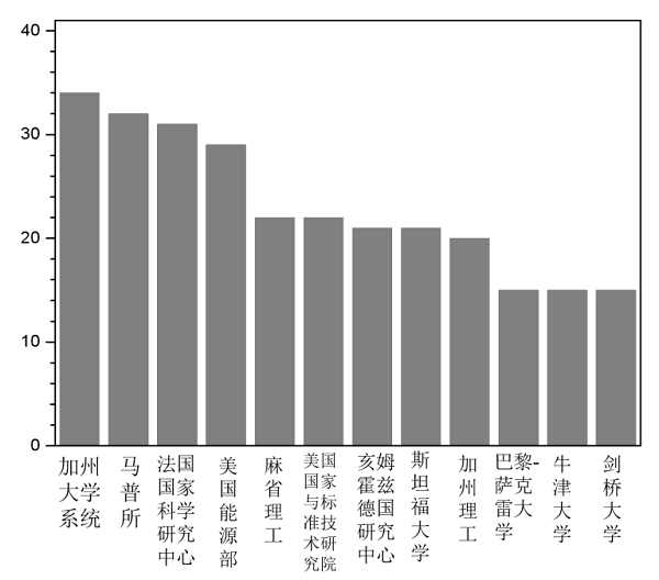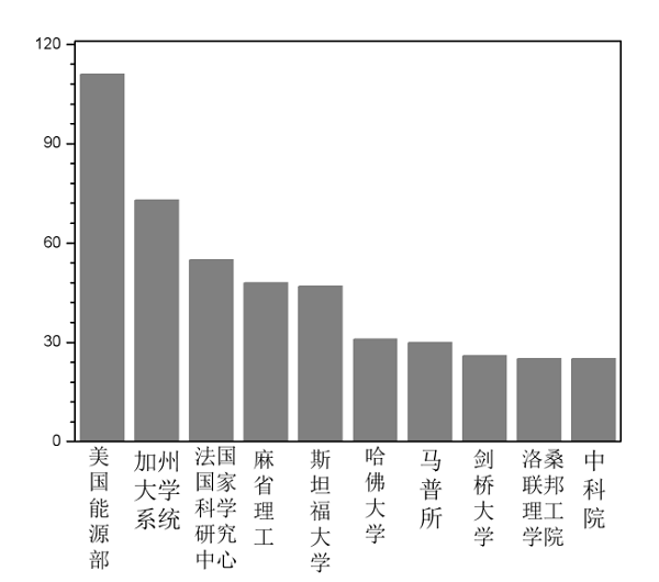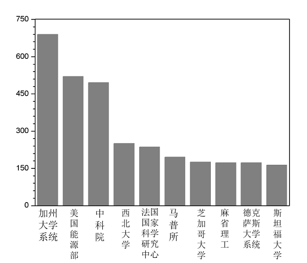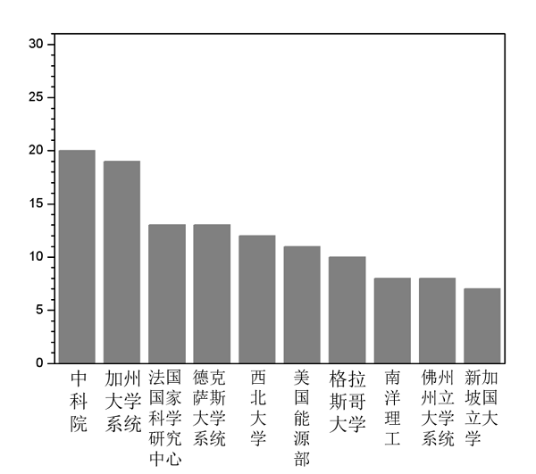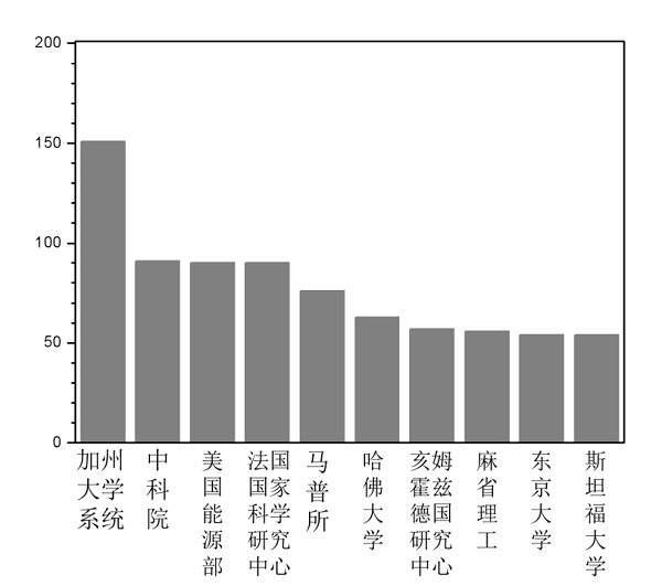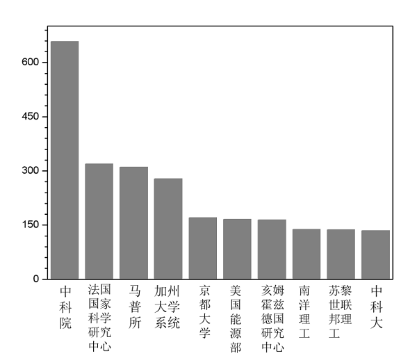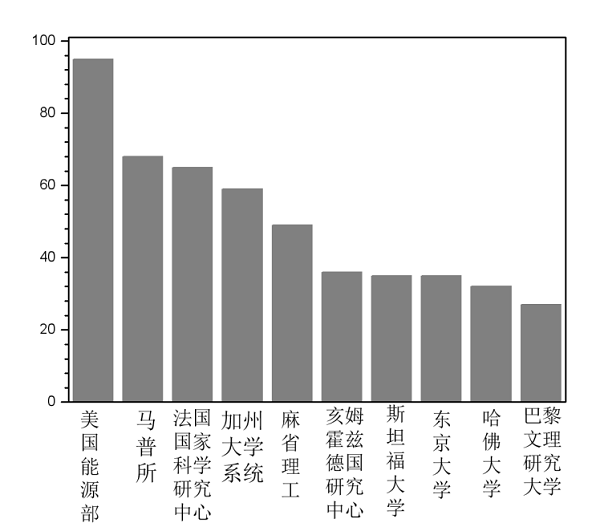 2、中国在顶刊中出现的总数也是很可观的。特别是AM,中国总量是第一,并且在接下来的机构统计中,排名前十有一半是中国的科研机构,具体是什么原因,大家可以在留言区提出自己的见解,与读者们一同分享。但是这个现象也仅仅只出现在AM上,在Science、Nature和PNAS中,排名前十的机构没有一个是中国的,而其他顶刊上,基本上也只有中科院入围。