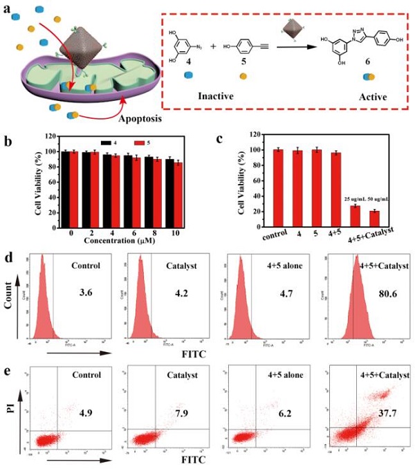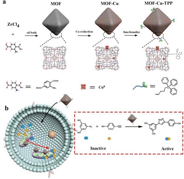 (b)细胞内生物正交反应用于MOF-Cu-TPP催化的线粒体下的原位药物合成。