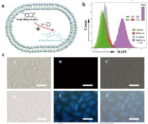 (a)MOF-Cu催化香豆素叠氮与苯乙炔在活细胞中的点击反应示意图;